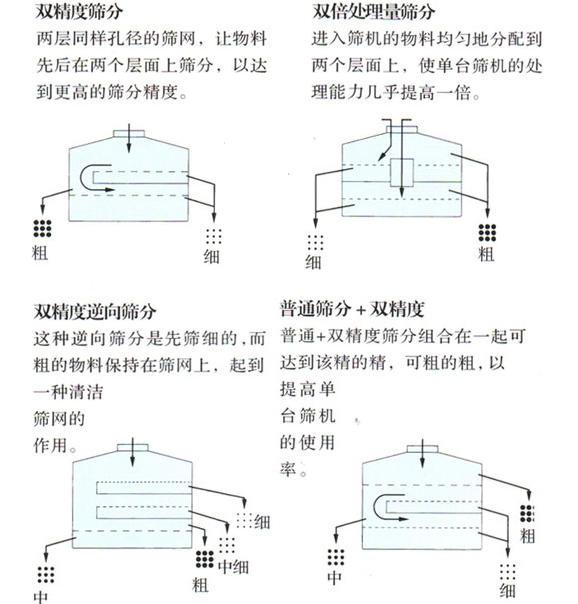 基本的回轉(zhuǎn)運動與人工篩分相類似。偏心率從25到40mm可調(diào),低速V型皮帶驅(qū)動從120到360rpm可調(diào)。每一種產(chǎn)品的停留時間可以通過搖擺篩的徑向與切角朝驅(qū)動軸線方向進行調(diào)整。因此建立水平與拋擲三維翻滾運動。物料從中心到外緣在整個篩面上均勻分散,從而以螺旋運動往軸向傳播。細小顆料從而完成了整個篩分過程。水平與垂直加速度隨著粒子的運動而增加,接近篩孔尺寸的顆粒隨之成功分離;較大顆料被運送到出口處,出口處由一個可調(diào)節(jié)的導(dǎo)向裝置控制流量中,該導(dǎo)向裝置是控制物料停留時間的另一個因素。此次過程在每篩層之間重復(fù)進行。